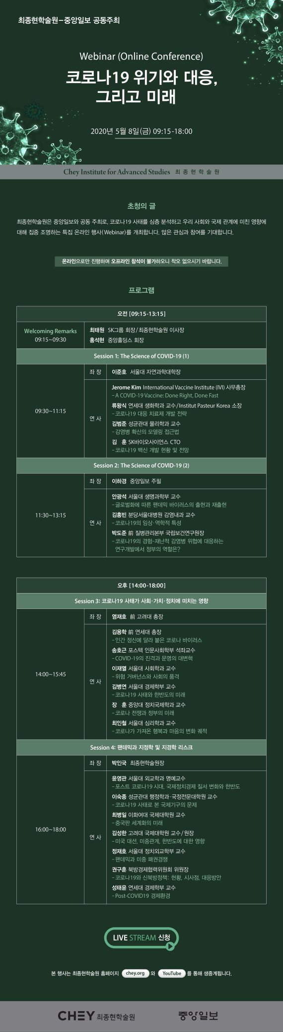 중앙일보와 이 콘퍼런스를 공동주최하는 최종현학술원은 이날 오전 9시 15분부터 오후 6시까지 최종현학술원 홈페이지, 중앙일보 홈페이지에서 콘퍼런스를 실시간 생중계한다.
