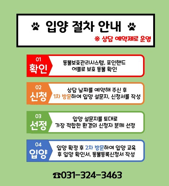 동물보호센터에서 보호중인 유기동물을 입양하려면 우선 동물보호관리 앱인 포인핸드로 동물을 확인한 뒤 시 동물보호센터로 상담 일정을 예약해야 한다.