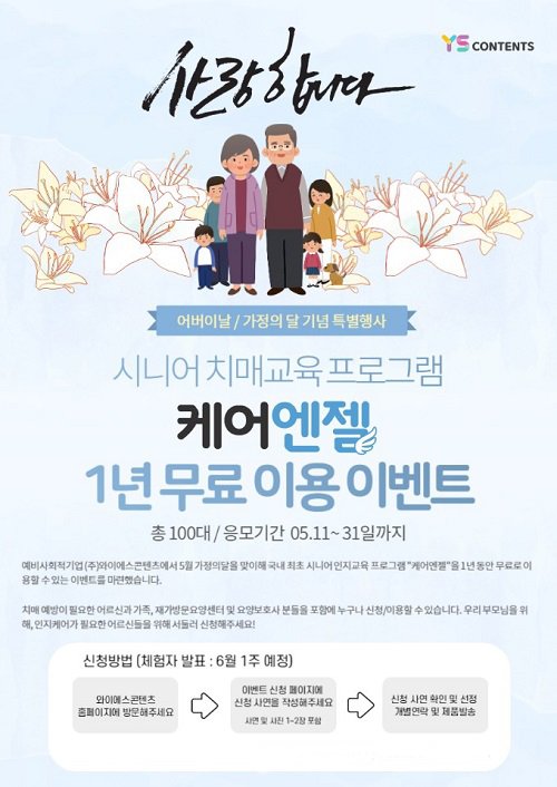 서울시/고용노동부 예비사회적기업 ㈜와이에스콘텐츠가 국내 최초 가정방문 치매교육 프로그램인 케어엔젤, 1년 무료이용 사회공헌 행사를 진행한다.