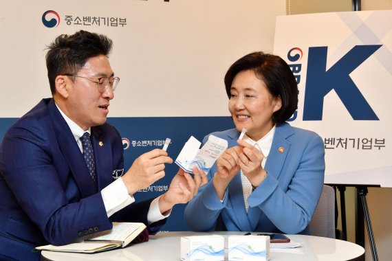 박영선 중소벤처기업부 장관(오른쪽)과 유재형 솔젠트 대표이사가 솔젠트의 코로나19 진단키트를 보면서 대화하고 있다. 사진=서동일 기자