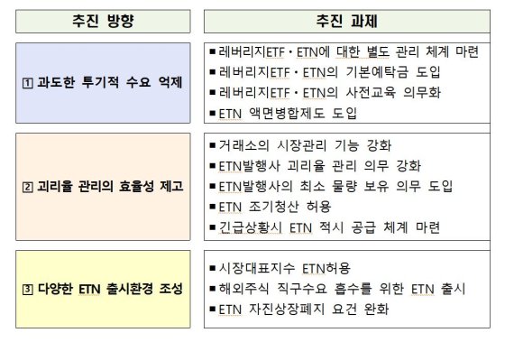 오는 3·4분기까지 파생상품투자가 수반되는 레버리지(±2배) ETF·ETN을 일반 주식시장에서 분리해 별도 시장으로 관리하는 방안도 마련키로 했다. ETF·ETN 파생상품의 위험도에 따라 차별화된 상장심사, 투자자 진입규제 등 투자자 보호 장치를 도입하는 것이다. 이를 위해 5월 중 한국거래소를 중심으로 연구 용역을 추진한다.