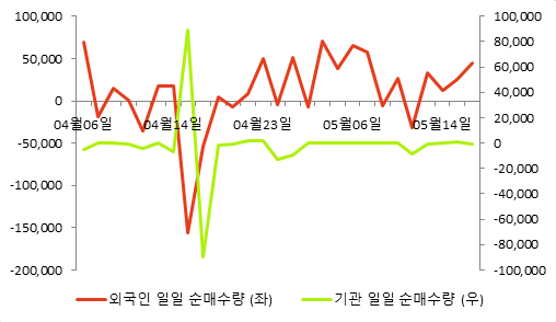다음 표는 동종목의 외국인, 기관의 일별 순매수량을 나타낸 것이다.