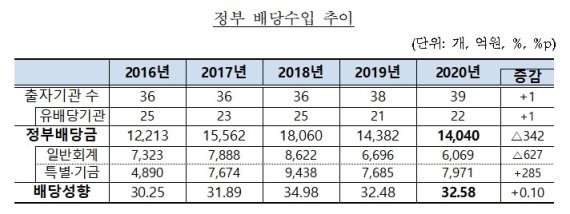 정부배당금은 총 1조4040억원으로 출자기관 당기순이익 감소 등의 영향으로 전년대비 342억원 감소했으나 평균 배당성향은 32.58%로 전년대비 0.10%포인트 상승했다.