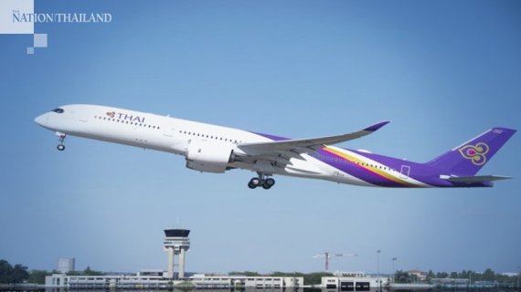 이륙하고 있는 타이항공 항공기. 더네이션타일랜드