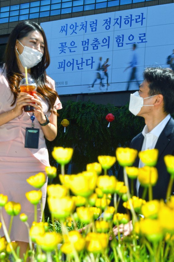 1일 서울 세종대로 교보생명 광화문글판이 새 옷을 갈아입었다. 이번 여름편은 백무산 시인의 시 '정지의 힘'에서 가져왔다. 광화문글판은 지난 1991년부터 30년째 계속되고 있다. 사진=서동일 기자