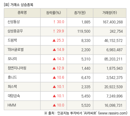 당일 상승한 종목의 수는 391개, 하락 441개, 보합 71개이다. 상승한 종목으로 신성통상(005390) 30.0%, 삼성중공우(010145) 29.9%, 드림텍(192650) 25.3% 등이 있다.