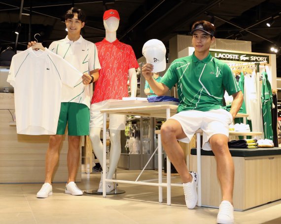 9일 신세계백화점 강남점 8층 라코스테 스포츠 매장에서 모델들이 라코스테X노박 조코비치 단독 의류 상품을 소개하고 있다. 신세계가 단독으로 선보이는 이번 노박 조코비치 콜라보 상품은 3가지 색의 폴로 셔츠를 초경량으로 제작했으며 2019년 마이애미 오픈과 지난 2월 호주 오픈에서 조코비치가 실제 착용한 의상이다.