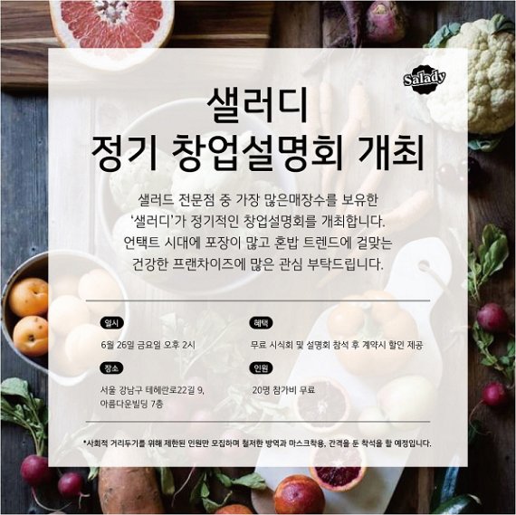 샐러디 정기 창업설명회는 생활 속 거리두기의 실천을 위해 선착순 20명의 제한된 인원만 모집하며 철저한 방역과 마스크 착용, 간격을 둔 착석 등을 시행할 방침이다.