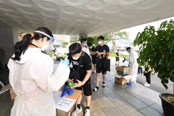 소방청이 20일 실시한 소방공무원 신규채용 필기시험을 실시한 가운데 응시자들이 입장 전 마스크 착용 확인 및 손소독제로 손소독을 하고 있다.