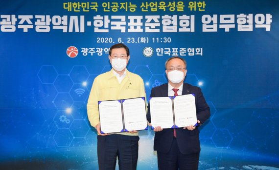 광주시는 23일 시청 비즈니스룸에서 이용섭 시장과 이상진 한국표준협회장 등이 참석한 가운데 '대한민국 인공지능 산업 육성을 위한 업무협약'을 체결했다고 밝혔다.
