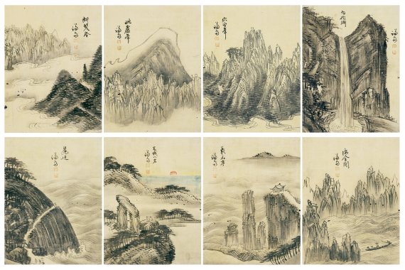수묵으로 그린 진경산수화 8점은 '단발령', '비로봉', '혈망봉', '구룡연', '옹천', '고성 문암', '총석정', '해금강' 순서로 구성돼 있고, 특히 주목되는 점은 보물 제1949호인 겸재의 1747년작 '해악전신첩'에는 없는 특정 경관 5폭, '비로봉', '혈망봉', '구룡연', '옹천', '해금강'이 추가돼 있어 겸재의 더욱 다양한 진경산수의 진수를 확인할 수 있다.