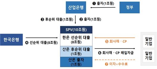 정부는 위험흡수 재원을 지원하고, 한은은 유동성 공급, 산은은 매입기구를 운영한다.