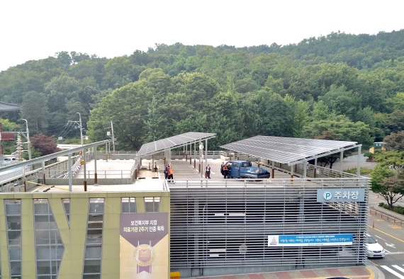 한국동서발전이 근로복지공단과 함께 사회공헌 사업으로 경기도 안산의 근로복지공단 안산병원 주차장에 설치한 옥상태양광 설비. 동서발전 제공