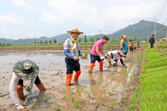 전남 장흥군이 친환경 농수산물을 기반으로 주민소득 향상에 본격 나서고 있는 가운데 정종순 군수(사진 왼쪽에서 두 번째)가 지난 6월 농민들과 함께 친환경 논에서 모내기를 하고 있다.사진=장흥군 제공