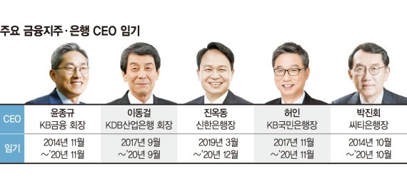 은행장들의 거취도 관심사다. 올 하반기에 이동빈(10월) 수협은행장, 허인(11월) 국민은행장, 진옥동(12월) 신한은행장, 김태오(12월) 대구은행장 등의 임기가 만료된다.