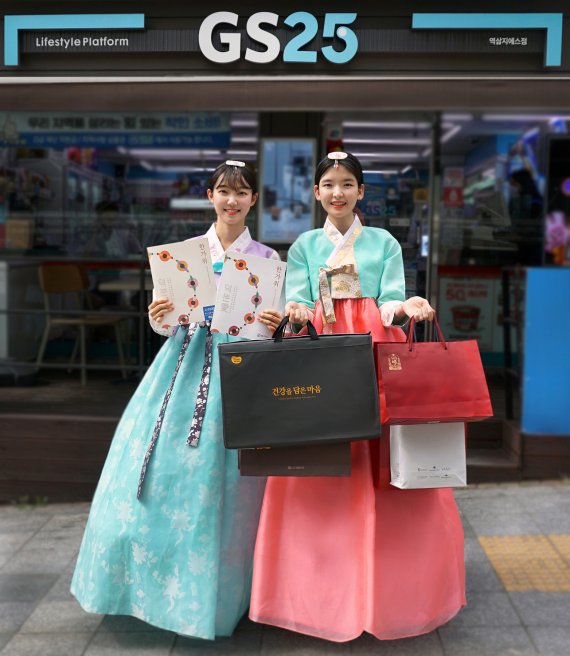 GS25매장에서 모델들이 추석선물세트와 카탈로그를 소개하고 있다.