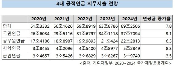 복지분야 법정지출 중 가장 예산 규모가 큰 4대 공적연금(국민·공무원·사학·군인) 의무지출은 연평균 7.8% 증가하는것으로 분석된다.