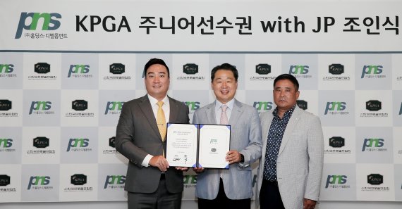 'PNS홀딩스 KPGA 주니어 선수권대회 with JP’ 협약서에 서명한 뒤 PNS홀딩스 김종윤대표이사, KPGA 한종윤 부회장, KPGA 김종필 운영위원장(왼쪽부터)이 포즈를 취하고 있다. /사진=KPGA