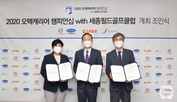 이날 조인식에는 오텍그룹 강성희 회장과 세종개발㈜ 정용원 대표이사, 그리고 KLPGT 강춘자 대표이사가 참석해 오는 10월 8일(목)부터 세종필드 골프클럽에서 열릴 2020 오텍캐리어 챔피언십 with 세종필드 골프클럽의 조인서에 서명했다.