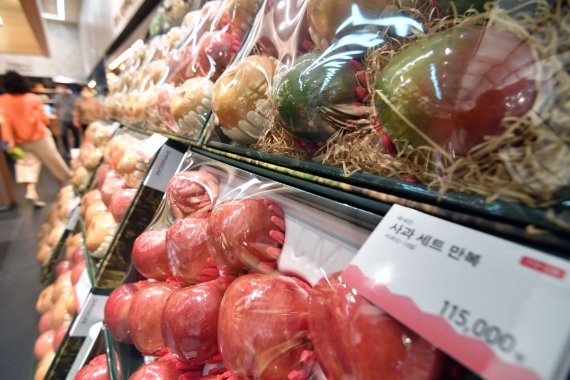코로나19 확산으로 비대면 명절을 보내려는 수요가 확산되고 정부도 경제 활성화를 위해 추석 농축수산 선물 한도를 10만원에서 20만원으로 한도 상향하면서 10만~20만원대 선물 수요가 늘고 있다. 15일 오후 서울시내 한 대형 백화점 추석선물세트 코너에 10만원이 넘는 상품들이 진열되어 있다. 사진=서동일 기자