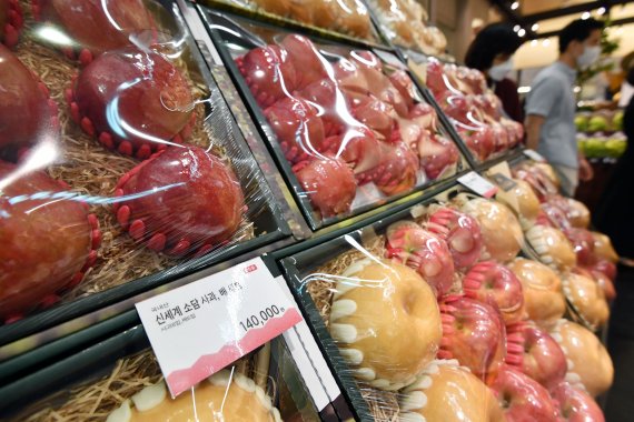 코로나19 확산으로 비대면 명절을 보내려는 수요가 확산되고 정부도 경제 활성화를 위해 추석 농축수산 선물 한도를 10만원에서 20만원으로 한도 상향하면서 10만~20만원대 선물 수요가 늘고 있다. 15일 오후 서울시내 한 대형 백화점 추석선물세트 코너에 10만원이 넘는 상품들이 진열되어 있다. 사진=서동일 기자