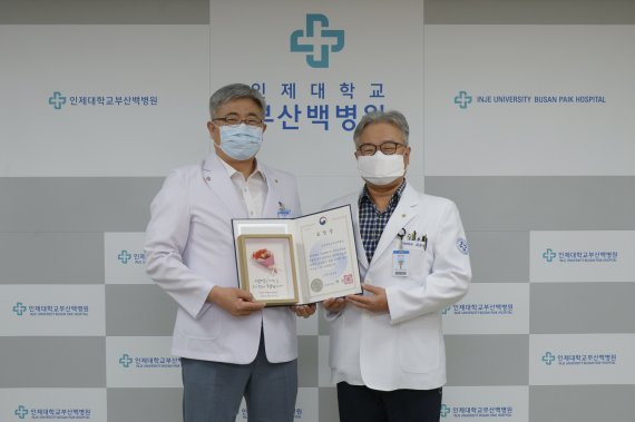 인제대학교 부산백병원 이연재 병원장(왼쪽)과 응급의학과 김양원 교수가 표창장을 들고 기념사진을 찍고 있다./제공=부산백병원