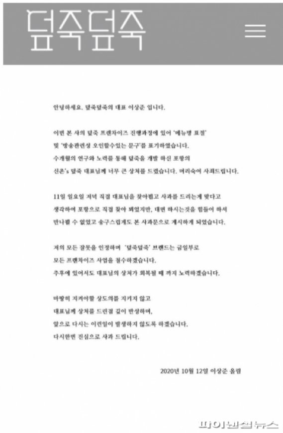 이상준 덮죽덮죽 대표가 12일 올린 사과문. 온라인 갈무리.