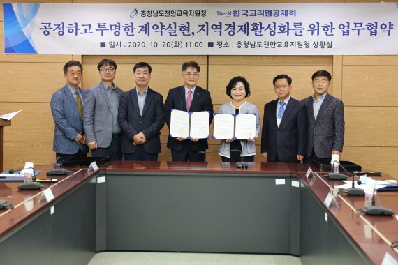 사진설명? 천안교육지원청에서 협약을 체결한 임병술 교직원나라 대표(왼쪽), 가경신 충청남도천안교육지원청 교육장(오른쪽)이 기념사진을 촬영하고 있다. (제공: 교직원공제회)