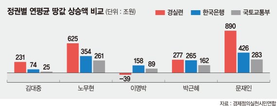 경실련은 "부동산 가격이 하향 안정화됐던 이명박·박근혜정부의 연평균 상승액(연평균 100조원)과 비교해 보면 문재인 정부 상승액이 9배나 된다"며 "1990년 이후 민간소유 땅값 상승액의 67%가 노무현·문재인정부에서 올랐다"고 설명했다.