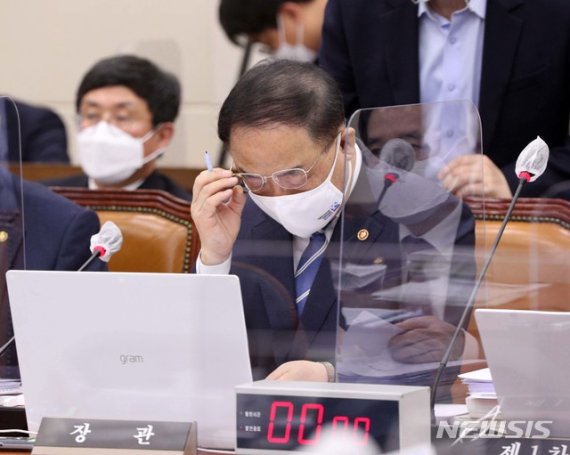 홍남기 부총리 겸 기획재정부 장관이 3일 오후 국회에서 열린 기획재정위원회 전체 회의에서 안경을 고쳐쓰고 있다.