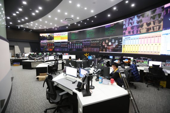 가장 먼저 찾은 곳은 운영동 3층에 위치한 '종합상황실'. 센터 운영의 주요 의사결정을 담당하는 곳으로 일명 '의사결정실'로 불리기도 한다. 상황실에는 70인치 대형 스크린이 총 4개 설치돼있다. 이 스크린은 56개 화면으로 구성돼, 각 계열사별 실시간 거래 상황 등을 보여준다. 상황실에는 '음성경보시스템'도 설치돼 있어 계열사 서버에 문제가 생기면 즉각 대응이 가능하도록 했다.