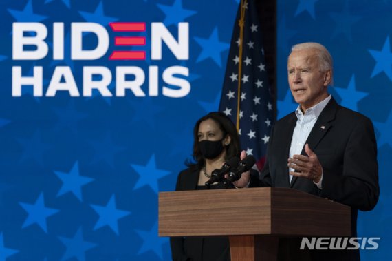 조 바이든 민주당 대선 후보가 5일(현지시간) 델라웨어주 윌밍턴에 있는 더 퀸 극장에서 카멀라 해리스 부통령 후보가 함께한 가운데 연설하고 있다./AP뉴시스
