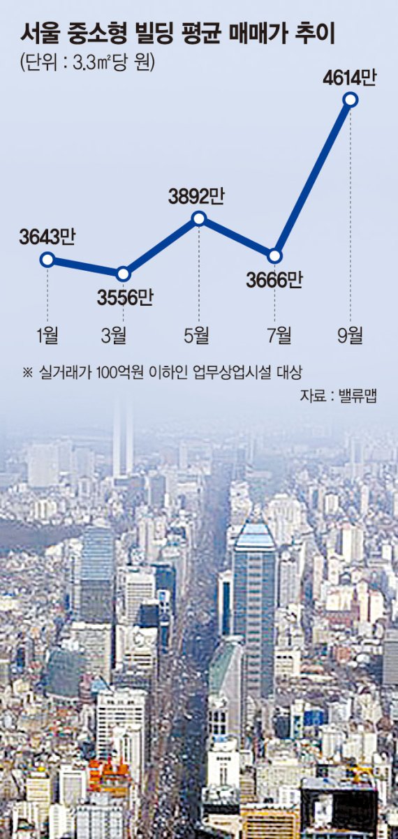 15일 부동산업계에 따르면 올 들어 꼬마빌딩의 인기가 치솟고 있다. 중소형 빌딩 전문중개업체인 리얼티코리아에 따르면 올해 3·4분기(7~9월) 1000억원 미만의 중소형빌딩 거래량은 355건으로 지난해 같은 기간(241건)보다 47% 급증했다. 올 상반기 거래량 388건에 육박한다. 금액 기준으로는 지난해 같은 분기(1조9400억원)에 비해 47% 증가했다. 2017년 1·4분기 후 가장 많다. 전문가들은 정부의 고강도 주택시장 규제로 상업용 부동산의 수요가 커졌다고 본다.