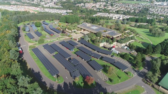 한화큐셀 모듈이 설치된 아비바 스코틀랜드 퍼스 본부 주차장 전경.