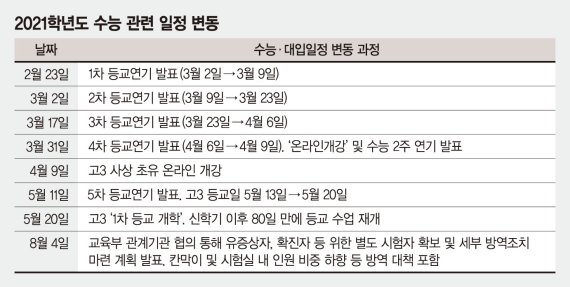 올 대입 수능을 준비한 수험생과 학부모들은 통째로 바뀐 수능·대입 일정을 일일이 확인해야 하는 불편을 겪어야 했다. 학부모 정모 씨는 "코로나19 때문에 정신이 없는 와중에 바뀐 수시·정시 일정을 하나하나 챙기느라 정신이 없었다"고 했다.