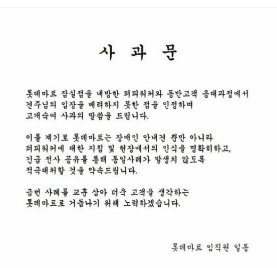 [파이낸셜뉴스] 롯데마트가 예비 안내견 출입거부 및 미흡한 대응 논란에 사과했다. 롯데마트는 30일 사과문을 통해 “롯데마트 잠실점을 내방한 퍼피워커와 동반고객 응대과정에서 견주의 입장을 배려하지 못한 점을 인정한다”며 “고객숙여 사과의 말씀을 드린다”고 밝혔다.