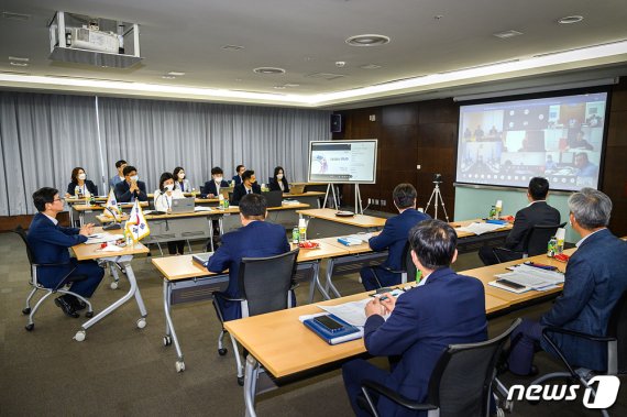 한국철도(코레일) 손병석 사장(왼쪽 첫번째)이 최근 대전 본사에서 영상으로 진행된 '제35차 국제철도협력기구(OSJD) 사장단 회의'에 참석한 모습. 뉴스1