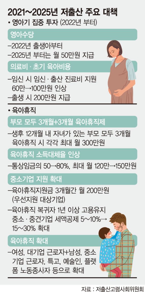 아동 출생 시 일시금 200만원을 지급하는 '첫만남 꾸러미' 제도도 2022년 신규 도입한다. 총 300만원을 의료비와 초기 육아비용으로 지원한다. 건강보험 내 임신과 출산 진료비 지원은 60만원에서 100만원까지 인상한다. 이번 방안은 육아휴직 확대에도 방점이 찍혔다.