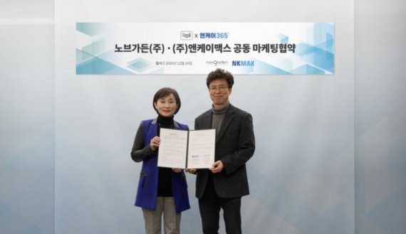 사진설명: 김은주 노브가든 대표(사진 좌측)와 최형남 엔케이맥스 전무(우측)가 협약서를 들고 기념촬영을 하고 있다.