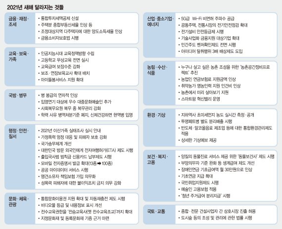 2021년 부동산과 관련된 세금의 세율이 대폭 인상되고 공제 조건은 까다로워진다. 코로나19로 경영난을 겪는 자영업자를 위한 부가가치세 간이과세 적용대상이 확대된다. 한국형 실업부조인 국민취업지원제도가 시행된다. 투명페트병은 별도로 분류 배출하는 등 친환경 정책도 강화된다. 고등학교 전면 무상교육이 실시되며 맞벌이 가구의 양육부담을 줄이기 위해 돌봄센터를 확대한다.