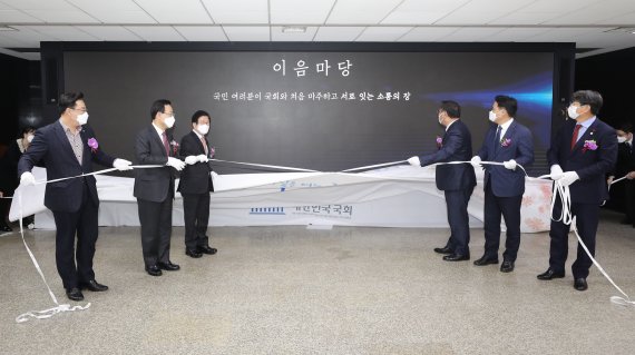 박병석 국회의장이 여야 원내대표 등 참석자들과 12일 오전 서울 여의도 국회 본관 1층 후면 국회 준공기 앞에서 이음마당 제막식을 하고 있다. 국민의힘(왼쪽부터) 김성원 원내수석부대표, 주호영 원내대표, 박병석 국회의장, 더불어민주당 김태년 원내대표, 김영진 원내수석부대표, 이춘석 국회 사무총장. 사진=서동일 기자