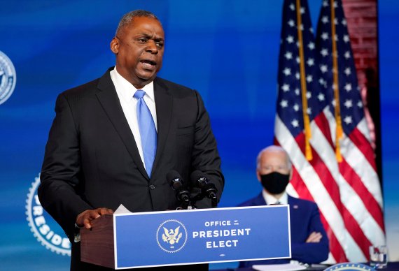 미국 국방장관 지명자인 로이드 오스틴 예비역 육군 대장이 지난달 9일(현지시간) 델라웨어주 윌밍턴에서 기자회견을 갖고 있다.로이터뉴스1