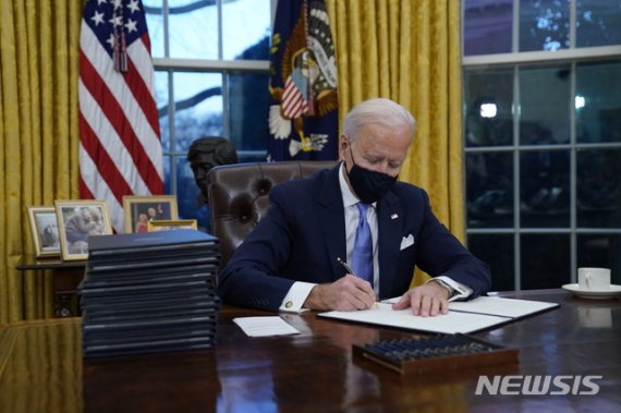 조 바이든 미국 대통령이 20일(현지시간) 백악관 집무실에서 첫 행정명령에 서명하고 있다. 바이든 대통령은 파리 기후변화 협약 복귀, 연방 시설 내 마스크 착용 의무화, 세계보건기구(WHO) 재가입 등에 관한 행정명령에 서명했다. /사진=뉴시스