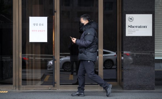 코로나19 장기화로 호텔 등 숙박업 경영난이 지속된 가운데 1일 서울 서초구 쉐라톤 서울 팔래스 강남호텔에 영업 종료 안내문이 붙어 있다. 이 호텔은 1982년 반포 팔래스호텔로 시작한 강남 최초의 특급호텔로 코로나19 확산세에 지난해 1~3분기 매출은 전년 동기 대비 40% 감소한 169억원을 기록했고, 영업손실은 19억원에서 86억원으로 껑충 뛰었다. 쉐라톤 서울 팔래스 강남은 부동산개발업체 더랜드가 3천500억원에 인수, 호텔을 헐고 고급 공동주택을 개발할 예정인 것으로 알려졌다.사진=박범준 기자