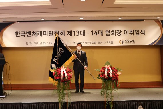 지성배 신임 한국벤쳐캐피탈협회 회장이 18일 열린 취임식에서 협회기를 흔들고 있다. /사진=한국벤처캐피탈협회