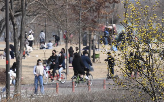 포근한 봄날씨를 보인 7일 산수유가 활짝 핀 서울 여의도 한강공원에서 시민들이 사회적 거리두기를 유지하며 휴일을 즐기고 있다. 사진=김범석 기자