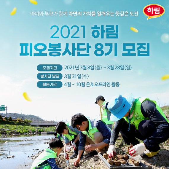 하림 피오봉사단 신청은 28일까지 하림 공식 SNS에 링크된 네이버 폼을 통해 하면 된다. 초등학교 이상 자녀와 함께 자연의 소중함을 행동으로 실천하며 특별한 추억을 만들고 싶은 소비자 가족 중 총 10가족을 선발할 예정이다. 자세한 내용은 하림 자연실록 공식 페이스북, 인스타그램, 블로그에서 확인할 수 있다.