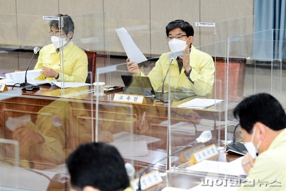 이석문 제주도교육감이 8일 오전 ‘코로나19 확산 대응 긴급회의’를 주재하고 있다. [제주도교육청 제공]