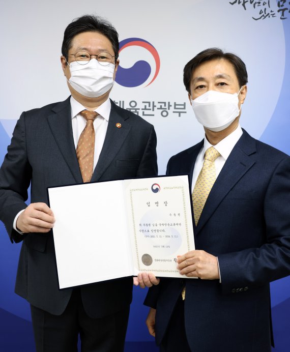 황희 문화체육관광부 장관이 12일 서울 용산구 문체부 저작권보호과 서울사무소 회의실에서 주동원 국제방송교류재단(아리랑국제방송) 사장(오른쪽)에게 임명장을 수여한 뒤 기념촬영을 하고 있다.