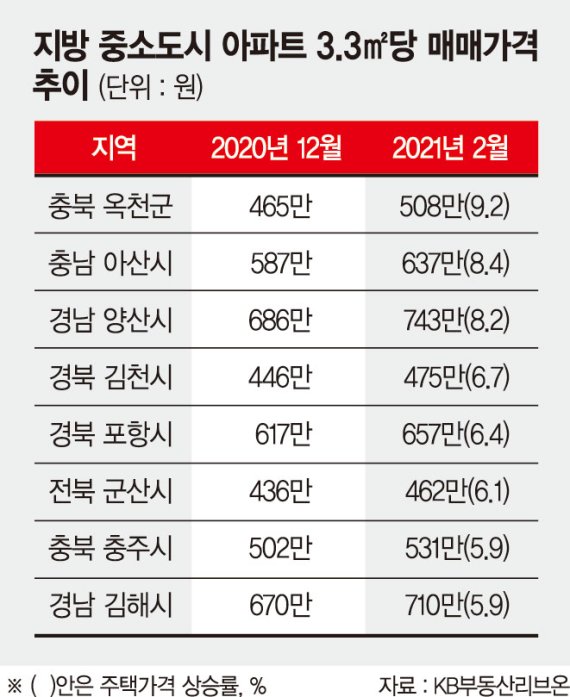 15일 KB부동산 리브온에 따르면 충북 옥천군 아파트 가격은 지난 달 기준 3.3㎡당 508만원이다. 지난해 12월 465만원보다 무려 9.2%나 올랐다.